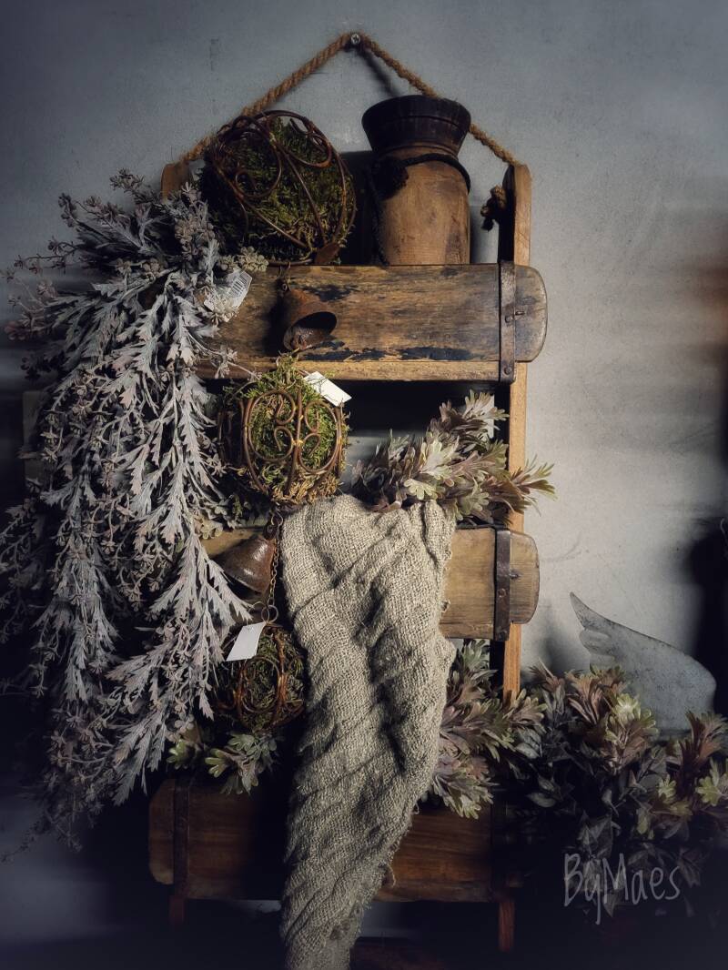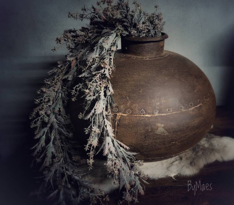 Oude bruine waterkruik, hier gedecoreerd met een mooie kunsttak van Brynxz